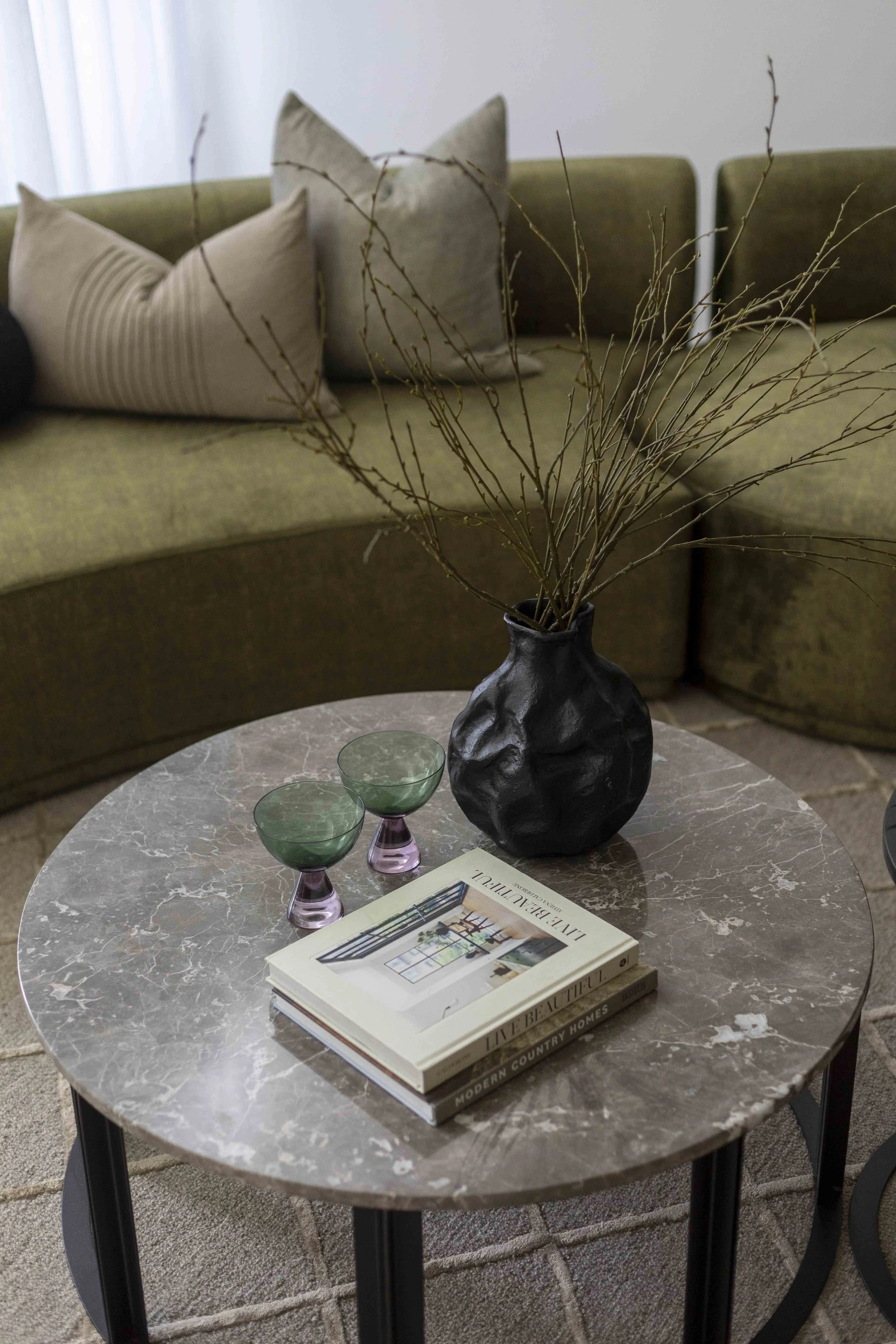 This interior styling showcases a serene, modern aesthetic with a focus on clean lines and calming neutral tones. The light-filled space is open and airy, with soft textures and minimalistic design elements. The curved, velvet green sofa creates a striking focal point, adding warmth and a touch of sophistication to the room.