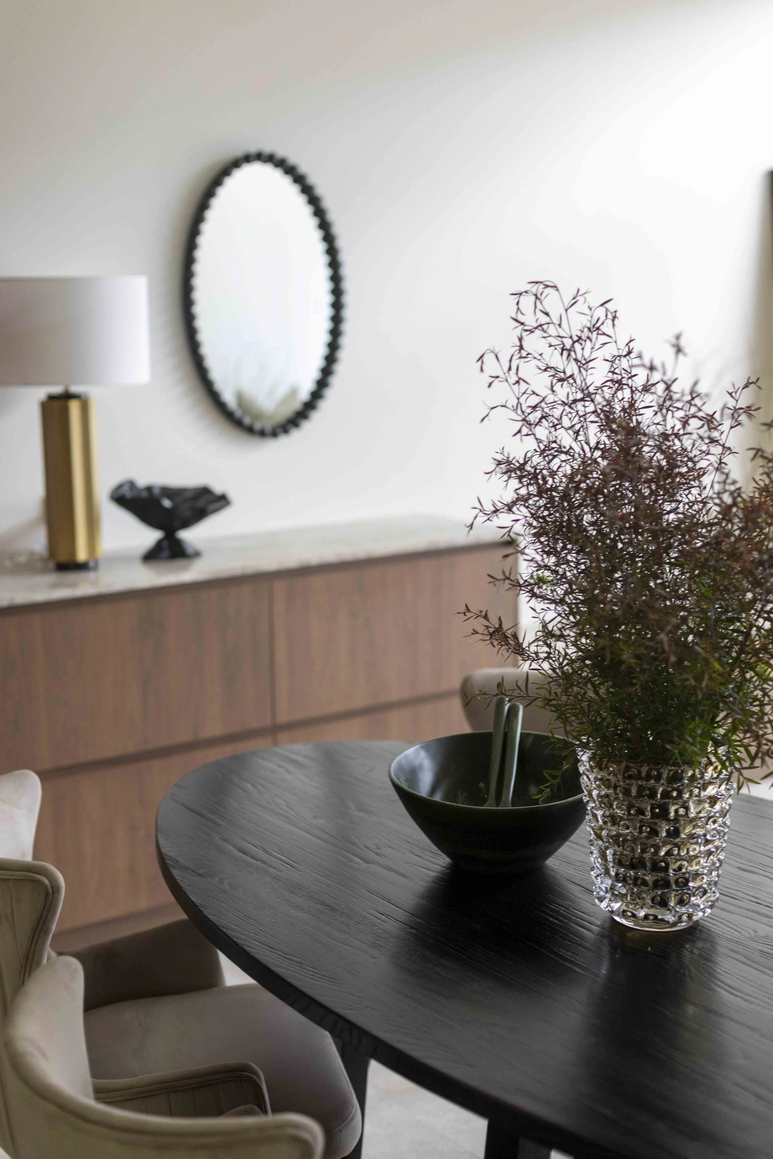 The dining area features a round wooden table paired with elegant, ribbed chairs, giving the space a balanced, inviting feel. Subtle, curated décor—such as the art pieces, vases, and greenery—adds personality without overwhelming the design. The combination of modern features, carefully chosen elements, and timeless pieces contributes to a space that feels both contemporary and enduring.